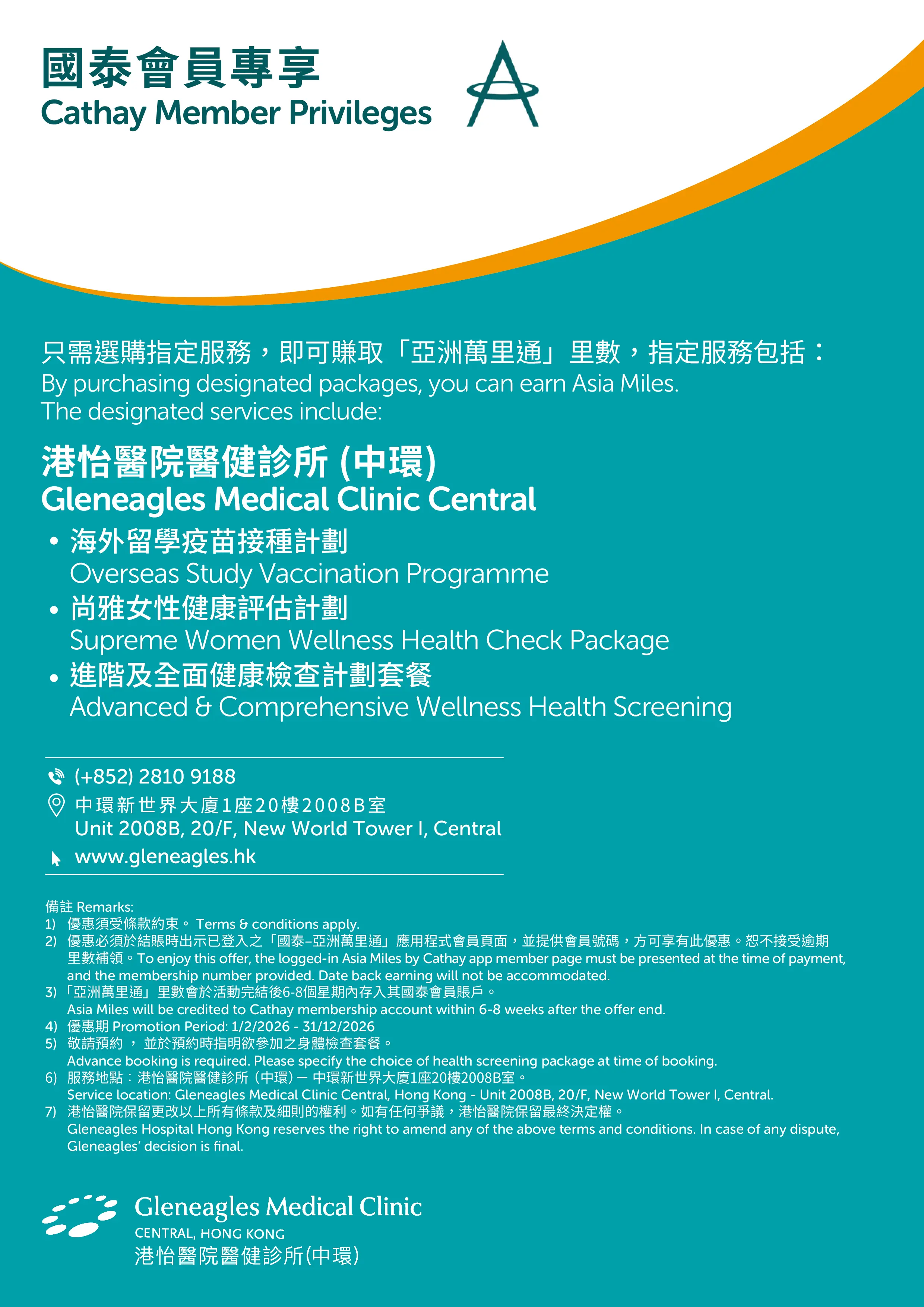 只需选购指定服务,即可赚取「亚洲万里通」里数,指定服务包括:
